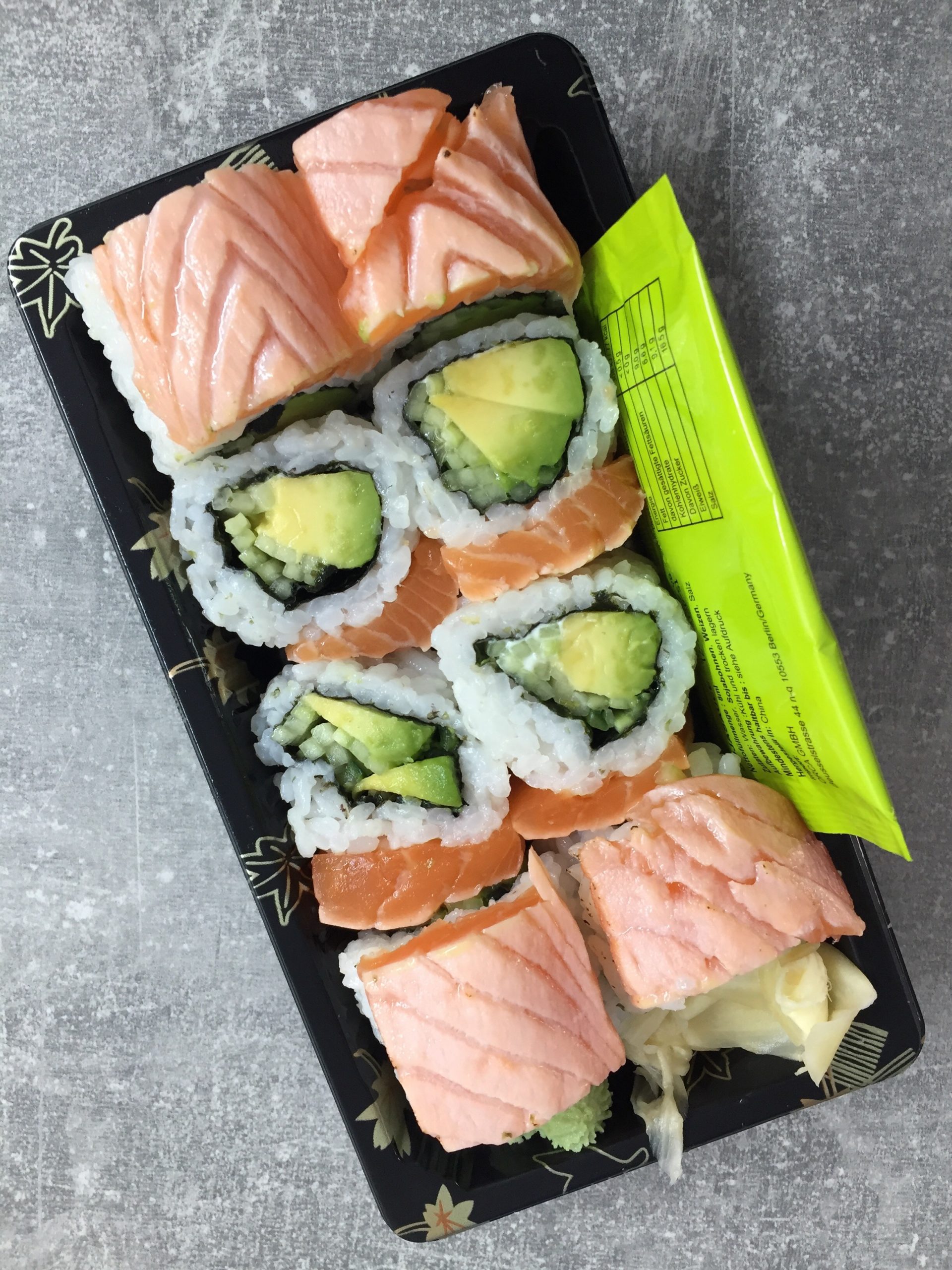 (8 Stk.) Avocado, Gurke, Frischkäse ummantelt mit flambiertem Lachs –