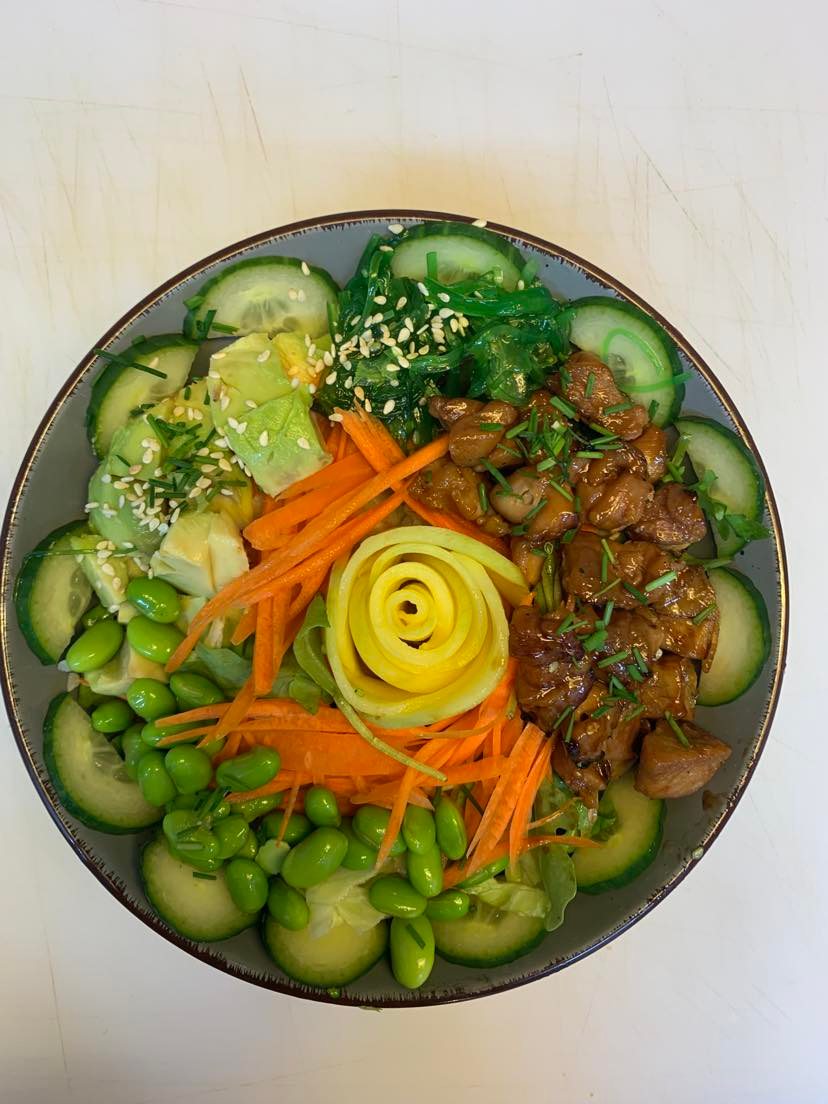 Große Reis-Bowl mit Algensalat, Avocado, Edamame, Gurke, Mango, Möhrenstreifen, Salatmix, Sesam, Schnittlauch, Sesam Sauce – A, F, K, 6.